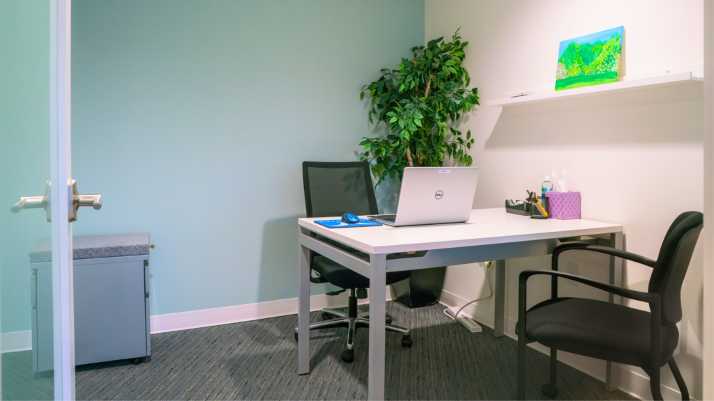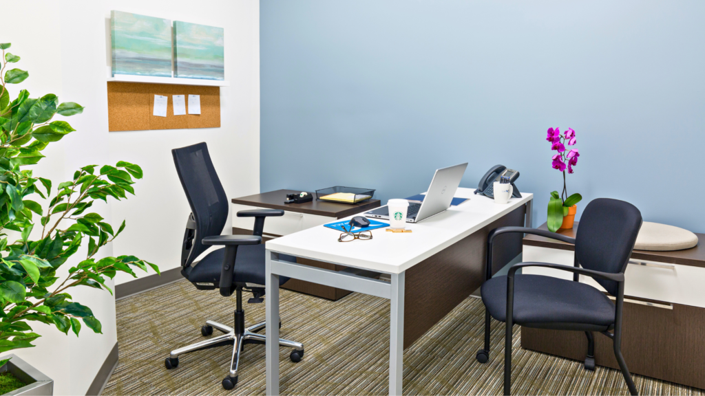 - Private, locking, fully furnished office (desk, adjustable task chair, storage pedestal and guest chairs)